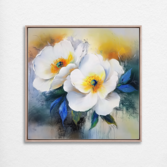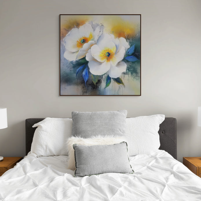 Hand-painted wall art featuring delicate white blooms embraced by vivid blue foliage. This refreshing composition celebrates nature with elegance and joy.