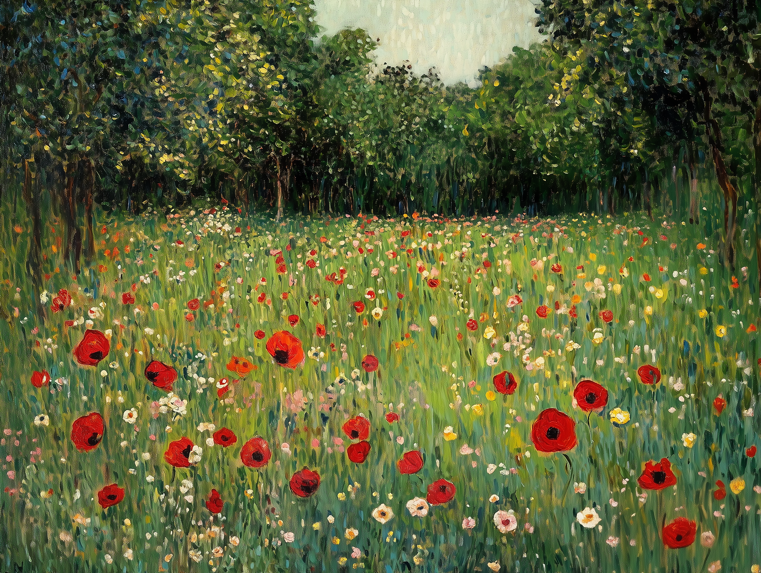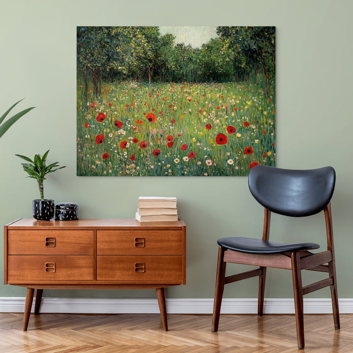 A lush meadow abundant with red poppies and delicate wildflowers evokes a mood of tranquil celebration and rich natural beauty. This vibrant composition features saturated colors and a tranquil sky. It is an ideal decorative choice for living rooms, bedrooms, dining areas, hallways, or kitchens.