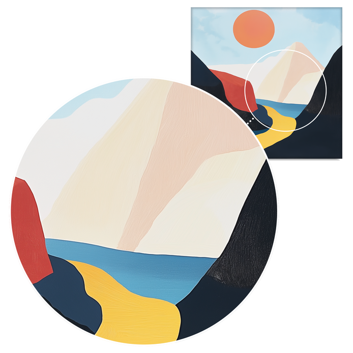 This abstract landscape establishes a mood of quiet harmony, guiding the eye through bold shapes and soft gradients. Its minimalist composition emphasizes the delicate balance between defined structure and natural forms. This piece is ideal for adding sophistication to living rooms, offices, or hallways.