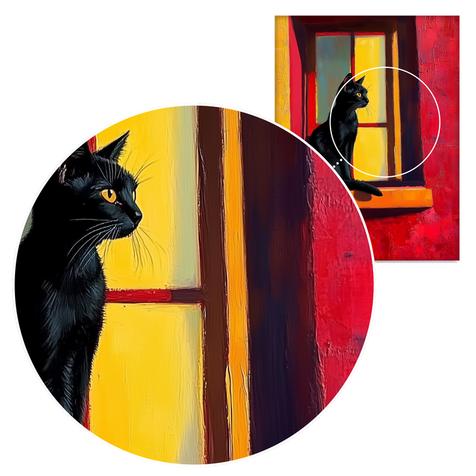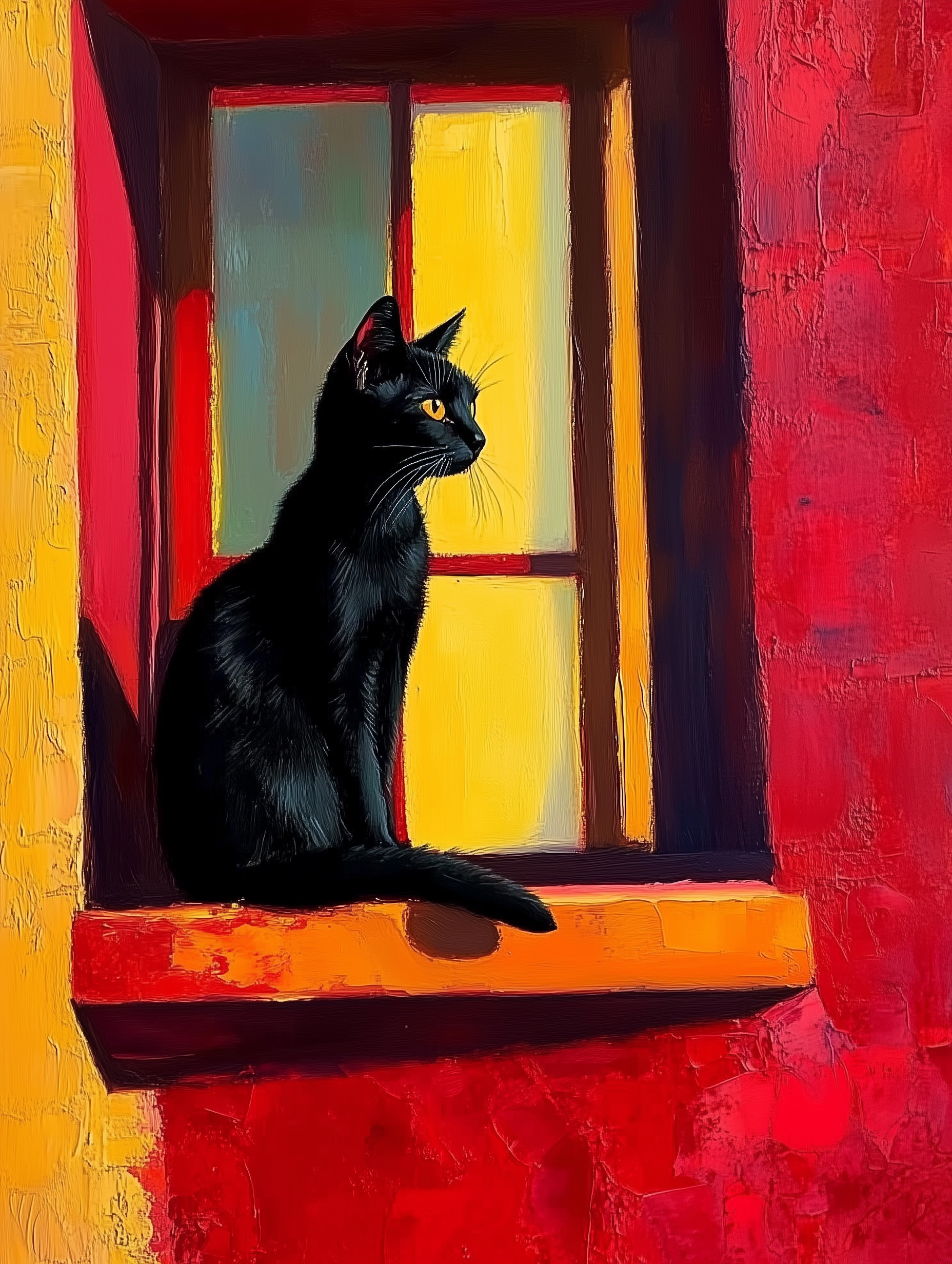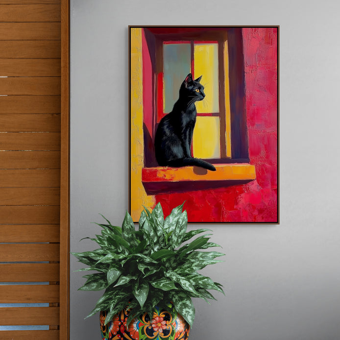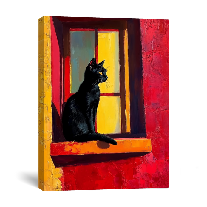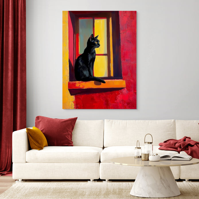 This hand-painted wall art features a striking black cat perched on a window sill, surrounded by vivid red and yellow walls. The detailed artwork captures a moment of tranquility and contemplation.
