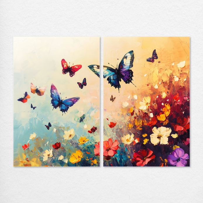 A fluttering cascade of butterflies fills the air with joyful freedom, capturing the fleeting beauty of nature's delicate creatures. This maximalist composition features vivid, seamlessly merged colors that celebrate a garden in full bloom. It is an ideal piece for energizing living rooms, bedrooms, dining areas, or kids' rooms.